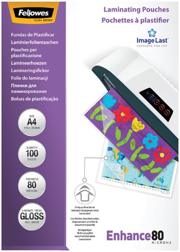 ImageLast lamineerhoezen beschikken over een pijl in de lijm die de juiste richting van invoeren weergeeft. Pijl verdwijnt vanzelf na lamineren.
