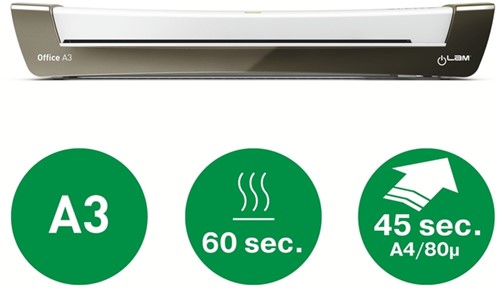 A3 lamineermachine in mooi design met korte opwarmtijd. Opwarmtijd slechts 1 minuut. Geschikt voor 80 tot 125 micron.