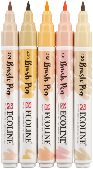 Set "Beigeroze" met 5 Talens Ecoline Brush pens in de kleuren abrikoos (258), rozebeige (374), pastelrood (381), beige (420) en lichtsepia (439) in een kunststof etui.