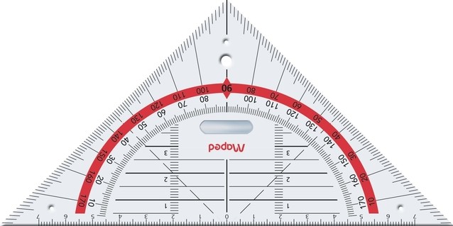 Heeft 4 functies in 1: gekalibreerde driehoek, het tekenen van symmetrische lijnen, het tekenen van parallelle lijnen en het is een gradenboog.