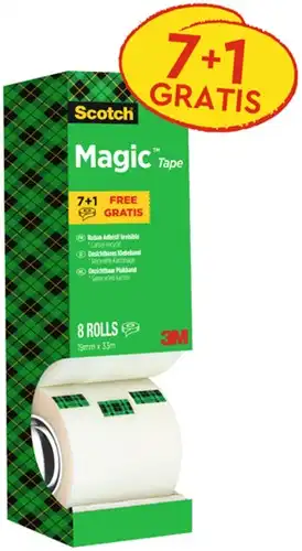 Scotch® Magic™ Tape is de originele, onzichtbare tape met een matte afwerking om kleine onvolkomenheden thuis, op school en op kantoor te repareren. De klevende tape geeft u een sterke, veilige en permanente afdichting dankzij de vertrouwde lijmtechnologie van 3M, die doorzichtig wordt na het aanbrengen. Het heeft een gemakkelijk aan te brengen ontwerp en is fotoveilig, droogt niet uit en vergeelt niet. Scotch® Magic™ Tape is verkrijgbaar in diverse breedten en lengten en past in allerlei plakbandhouders.