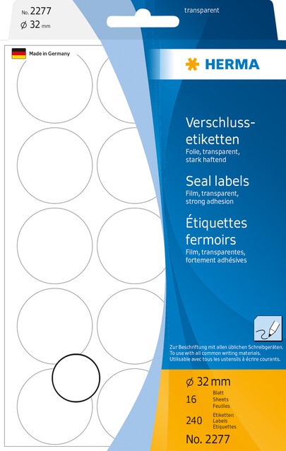 Zelfklevende sluitetiketten van transparante polyesterfolie met extra sterke kleefkracht.