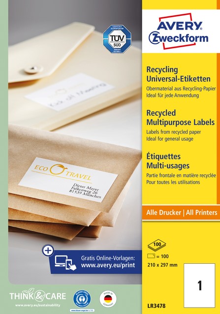 Etiket Avery LR3478-10 210x297mm recycled wit 10 stuks