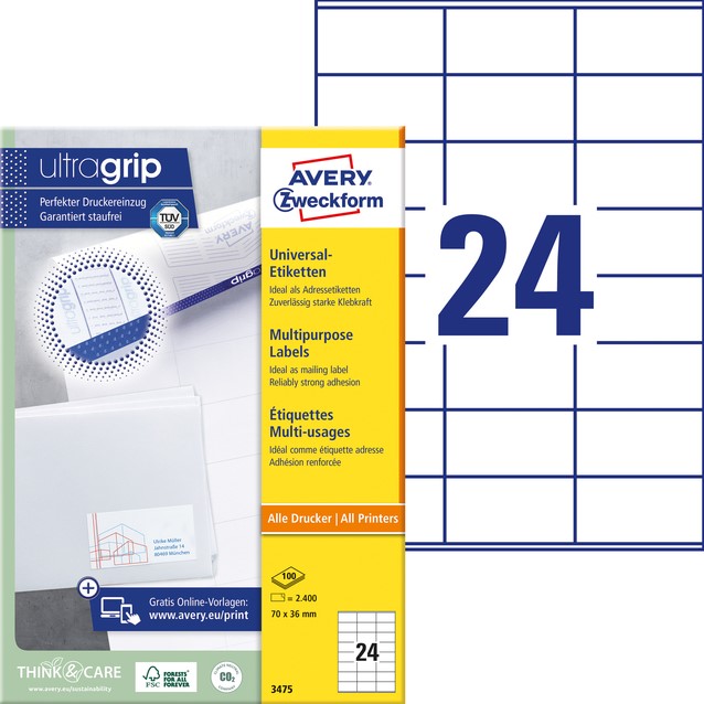 Etiket Avery LR3475 70x36mm recycled wit 2400 stuks