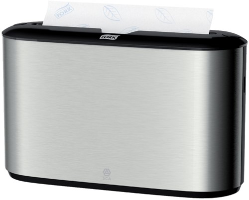 De Tork Xpress multifold papieren handdoekdispenser voor flexibele plaatsing zonder boren is ideaal voor de luxere toiletruimtes waar naast hygiëne, stijl ook belangrijk is.