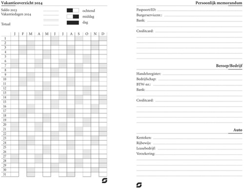Naast het calendarium bevat deze box: een transparant beschermblad, personaliakaart, tabkaarten, een verjaardagskalender, een overzicht voor regelmatige betalingen, maandblaadjes, things-to-do, kaspapier, een alfabet, notitiepapier en diverse informatiebladen en landkaarten.