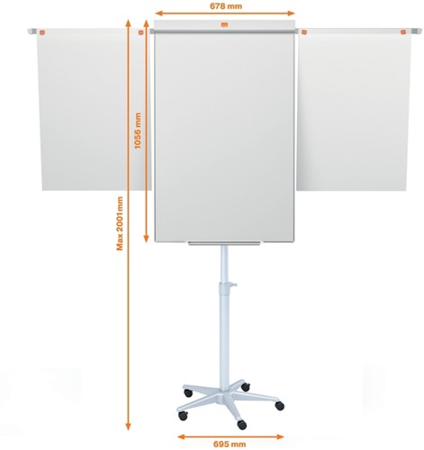 De mobiele, magnetisch stalen flipover heeft een modern, onopvallend en smal frame waardoor de ruimte van het bord wordt gemaximaliseerd, met de ruime pennengoot geplaatst onder het bord zonder de schrijfruimte te blokkeren. In hoogte verstelbare mobiele voet met vergrendelbare zwenkwielen om te verplaatsen en vast te zetten. Uitklapbare magnetische armen bovenaan de flipover, die gemakkelijk kunnen worden uitgeschoven om extra pagina's te ltonen. Magnetisch whiteboardoppervlak van staal biedt een verhoogde uitwisbaarheid.