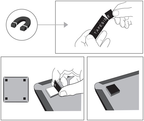 Zelfklevende pads en magneten voor bevestiging aan de muur of op een metalen oppervlak.
