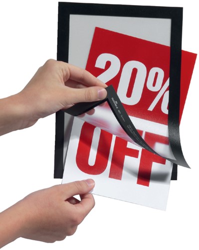 Duraframe is een zelfklevend kader, bestaande uit twee transparante folies die samen worden gehouden door de magnetische rand.