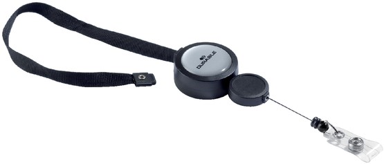 Uittrekbaar koord in een kunststofhouder. Aan de drukknop-lus kunnen gemakkelijk congresspelden worden bevestigd.