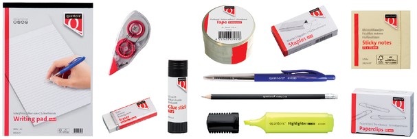 Inhoud koffer: schrijfblok, zelfklevend memoblok, plakband, highlighter, pen, potlood, lijmstift, correctieroller, paperclips en nietjes.