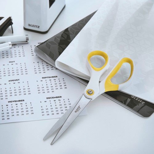 Schaar WOW Leitz kleur geel met titanium coating. De duurzame bladen met titanium coating blijven veel langer scherp dan standaard bladen. Met comfortabele ergonomische zachte handgreep in opvallende en stijlvolle WOW-kleuren. Op plasticvrije ophangkaart.