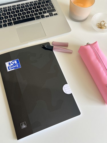 Een voordeelpak met daarin drie Oxford A4 schriften, twee zwarte en een turquoise.