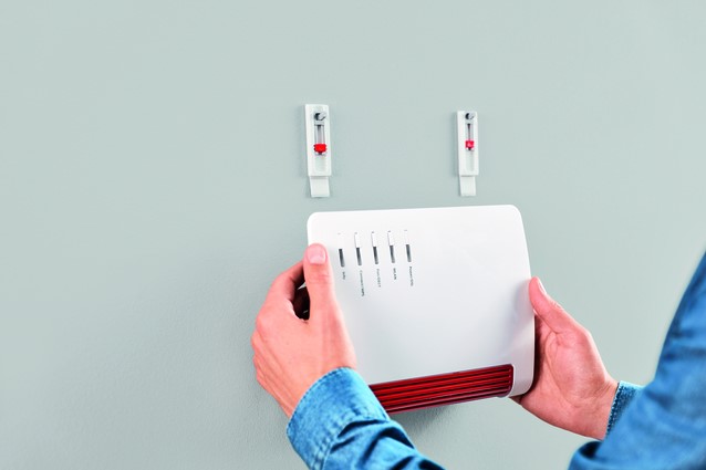 De tesa® Klevende Spijkers voor kleine apparaten zijn ideaal voor het ophangen van een wifi router met twee sleutelgatvormige bevestigingssleuven op licht oneffen en gevoelige oppervlakken.