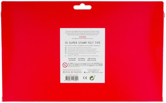 De verpakking bevat 10 stempelstiften in verschillende kleuren en stempels.