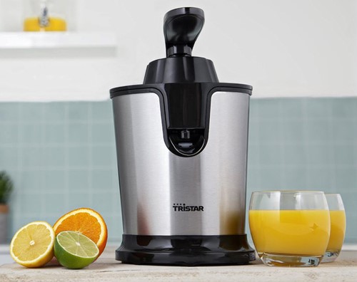 Elektrische citruspers met een stijlvol design en roestvrijstalen behuizing en pulpfilter.