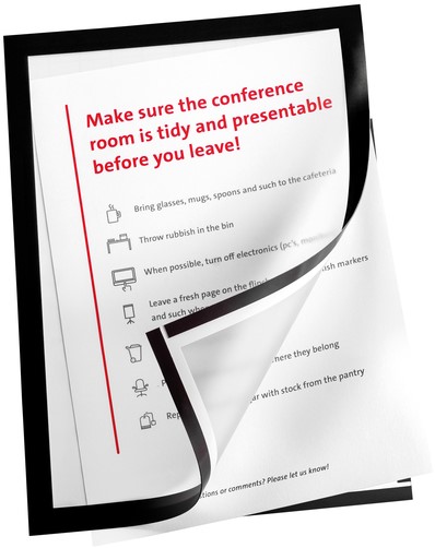 Met het Infokader zelfklevend van Quantore A4 presenteer je documenten, mededelingen of posters altijd netjes en professioneel. De zwarte rand geeft je presentatie een strakke en moderne uitstraling en het magnetische zichtframe is zowel staand als liggend te gebruiken. Dankzij de zelfklevende achterzijde kleeft het stevig op alle vlakke oppervlakken en kun je het eenvoudig herpositioneren zonder lijmresten achter te laten. Ideaal voor kantoren, winkels, scholen en openbare ruimtes. Verpakt per 2 stuks, zodat je direct meerdere plekken van duidelijke communicatie kunt voorzien. kenmerken: