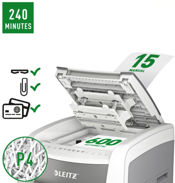 Volautomatische papiervernietiger met automatische invoerfunctie voor maximaal 600 A4-vellen.