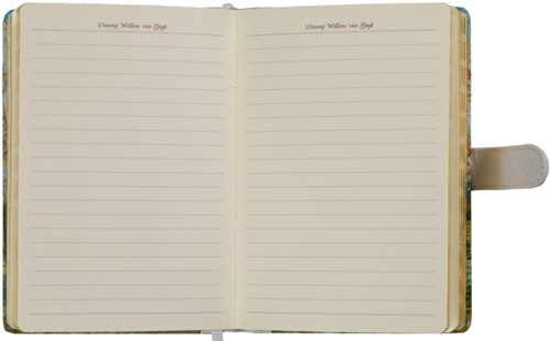 Notitieboek met een schitterende tekening van Vincent van Gogh op de voor- en achterzijde met de bloesem van een fruitboom tegen een blauwe achtergrond.