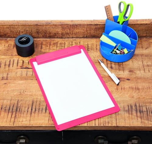 Duurzaam Blauwe Engel gecertificeerd klembord, voorzien van horizontale penhouder op de clip.