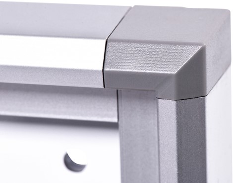 Binnenvitrine MAULextraslim, voor wandmontage, aluminium profiel, waarbij de hoeken met een grijs kunststof hoekstuk verbonden zijn.