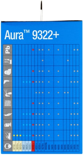 Het 3M™ Aura™ Stofmasker voor handmatig en machinaal schuren 9322+ is ons geventileerde gelaatsmasker met filter dat is voorzien van het Aura™ ontwerp met 3 panelen, een verstelbare neusbeugel, een voorgevormd neuspaneel, kleurgecodeerde hoofdbanden en het 3M™ Cool Flow™ uitademventiel voor comfortabel dragen. Het is FFP2-geclassificeerd en verkrijgbaar in een verpakking van 5 stuks.