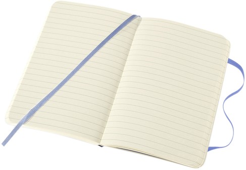 Kenmerken: afgeronde hoeken, elastische sluiting, ivoorkleurig Moleskine-papier, bijpassend leeslint, papier: 70 gsm, zuurvrij, “In geval van verlies”-label op het schutblad, uitbreidbaar binnenvak op achterkaft.