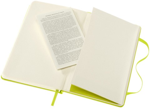 Kenmerken: afgeronde hoeken, elastische sluiting, ivoorkleurig Moleskine-papier, bijpassend leeslint, papier: 70 gsm, zuurvrij, “In geval van verlies”-label op het schutblad, uitbreidbaar binnenvak op achterkaft.