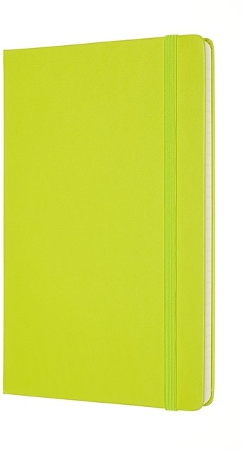Kenmerken: afgeronde hoeken, elastische sluiting, ivoorkleurig Moleskine-papier, bijpassend leeslint, papier: 70 gsm, zuurvrij, “In geval van verlies”-label op het schutblad, uitbreidbaar binnenvak op achterkaft.