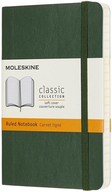 Kenmerken: afgeronde hoeken, elastische sluiting, ivoorkleurig Moleskine-papier, bijpassend leeslint, papier: 70 gsm, zuurvrij, “In geval van verlies”-label op het schutblad, uitbreidbaar binnenvak op achterkaft.