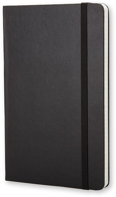 Kenmerken: afgeronde hoeken, elastische sluiting, ivoorkleurig Moleskine-papier, bijpassend leeslint, papier: 70 gsm, zuurvrij, “In geval van verlies”-label op het schutblad, uitbreidbaar binnenvak op achterkaft.