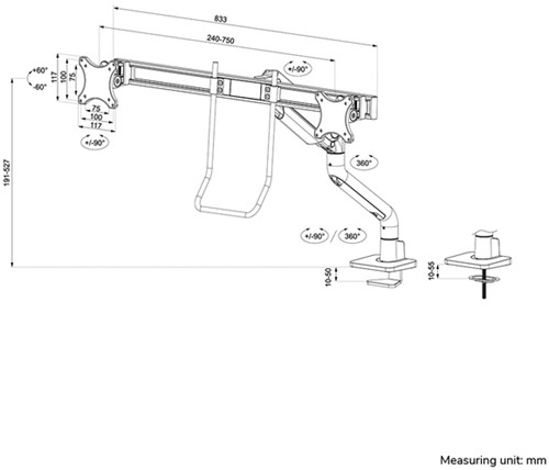 De arm is voorzien van een premium coating, gasgeveerde hoogteverstelling (19,1-52,7 cm) en diepteverstelling (17,3-71 cm), VESA quickrelease, 180°-stopmechanisme, waardoor deze goed bij een akoestische wand gebruikt kan worden, standaard uitgerust met een platte topfixklem en doorvoer, incl crossbar en hendel.