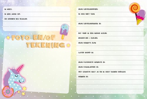 Laat je vriendjes en vriendinnetjes in dit leuke Unicorn vriendenboek schrijven. Ontdek leuke verhalen en grappige weetjes over ze. Wanneer zijn ze jarig en wat willen ze later worden? Wat is hun lievelingsdier en waar houden ze totaal niet van? Al je vriendjes en vriendinnetjes kunnen een mooie foto van zichzelf in dit vriendenboek plakken of een mooie tekening maken. Bewaar je herinneringen voor altijd! Wie laat jij in jouw vriendenboek schrijven?