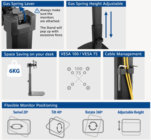 De steun is eenvoudig in hoogte verstelbaar zonder gereedschap. Gebruik de hendel om het gasveersysteem te ontgrendelen en vergrendelen. Door de schermen te kantelen, roteren of te zwenken creëer je de meest ergonomische werkhouding waardoor je de kans op nek-, rug- en schouderklachten verkleint.