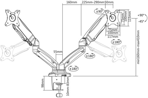 Dubbele bureausteun, eenvoudig in hoogte verstelbaar zonder gereedschap door het handige gasveersysteem.