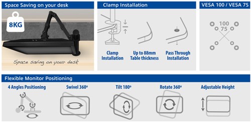 Met handig beeldscherm montagesysteem, de ACT AC8301 heeft 3 draaipunten voor het instellen van de ideale kijkafstand. De bureausteun is geschikt voor één beeldscherm tot 32 inch met een maximaal gewicht van 8kg.