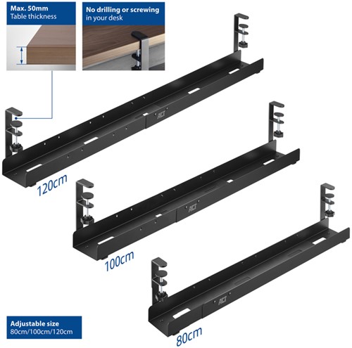 Uittrekbaar ontwerp: 80cm/100cm/120cm; geschikt voor bureaus met een maximale tafeldikte tot 50mm.