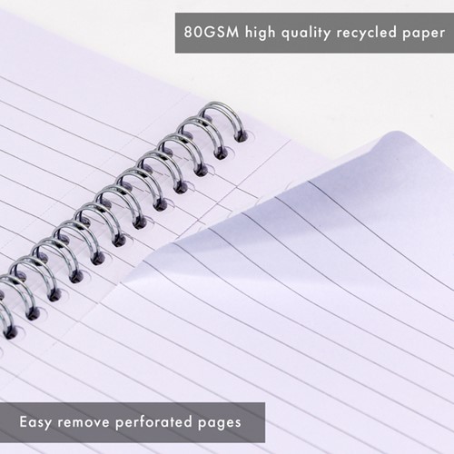 De gerecyclede Pukka Pads-lijn weerspiegelt Pukka's toewijding aan het creëren van ethische producten van hoge kwaliteit. We zijn er trots op dat we een assortiment gerecyclede notitieblokken van topkwaliteit kunnen aanbieden, zodat u duurzaam en stijlvol kunt zijn. De mogelijkheden voor onze notitieblokken zijn eindeloos, of het nu voor terug naar school, de universiteit of gewoon een ruimte voor uw ideeën is. Onze A5-notitieblokken zijn de perfecte aanvulling op je schrijfwarencollectie... Waarom kies je niet voor een milieuvriendelijk alternatief voor je gebruikelijke notitieblok? Het gerecyclede notitieblok heeft een A5-formaat van 145 mm x 210 mm en is gemaakt van 100% gerecycled 80gr papier van hoge kwaliteit. Elk notitieblok bevat 110 pagina's met een 8 mm-regel en een geperforeerde rand voor eenvoudig verwijderen. Het compacte A5-formaat is ideaal om onderweg notities te maken of herinneringen op te schrijven, omdat ze gemakkelijk in veel tassen passen. De gerecyclede notitieblokken worden verkocht in een verpakking van 3. Het beste deel is dat onze notitieblokken 100% gerecycled zijn, dus we helpen de planeet te redden!