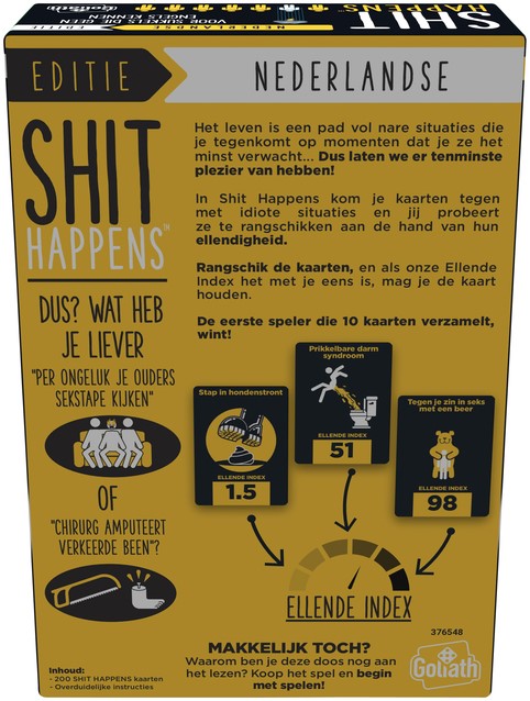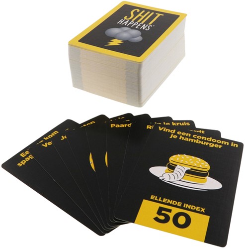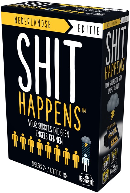 Shit Happens (NL): Hilarisch Leedvermaak in een Partyspel. Leven is een aaneenschakeling van momenten, soms geweldig en soms, nou ja, niet zo geweldig. Het is een rit vol verrassingen en onvoorziene gebeurtenissen. In het meedogenloos eerlijke partyspel genaamd Shit Happens (NL), wordt het leven in al zijn weerzinwekkende glorie omarmd en in een komisch jasje gestoken. Met kaarten die variëren van ranking 1 (niet erg) tot 100 (heel erg), daagt dit spel spelers uit om de ergheid van verschillende ongewenste situaties te beoordelen en ze op hun ‘lane of pain’ te plaatsen. Rangschik ongewenste situaties op de Shit’O’Meterschaal van 1 tot 100. Raad of de situatie milder, erger of ertussen in zitten. In het Nederlands.
