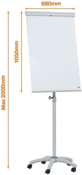 Magnetisch schrijfbordoppervlak (68 x 105 cm) inclusief pennenbakje. Snelsysteem voor het verwisselen van flipoverblokken, geschikt voor alle gangbare flipoverblokken. Zwenkwielen van kunststof (Ø 60 cm) met 5 vergrendelbare wielen, traploze hoogteverstelling van 180 tot 200 cm totale hoogte.