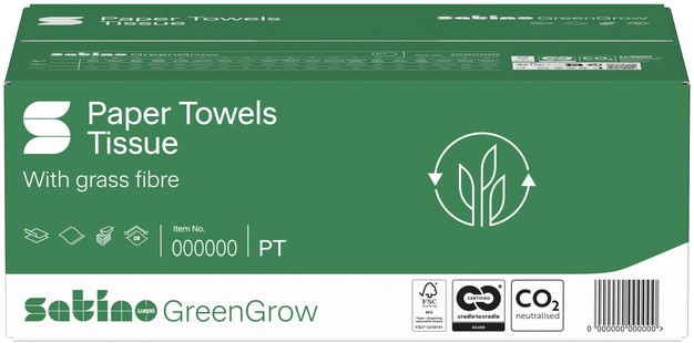 Aantal vellen: 250 vel Satino GreenGrow is hoogwaardig hygiënepapier met bijzonder duurzame eigenschappen. Producten uit deze productlijn wordt gemaakt van gerecycled papier, aangevuld met verse vezels van Miscanthus-gras. Deze grassoort wordt lokaal geteeld in West-Europa en de bodem wordt niet bemest, geploegd, bespoten of ingezaaid. Met een levensduur van vijftien tot twintig jaar lang groeit dit supergewas ieder jaar tot wel 4 meter hoog, waardoor het de bijnaam 'Olifantengras' heeft gekregen.