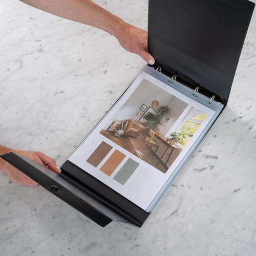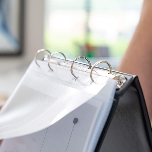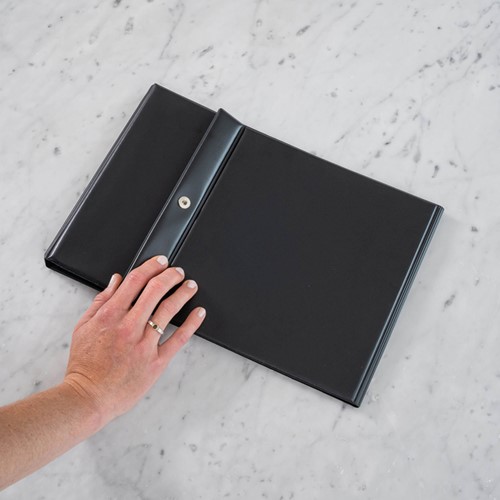 Inclusief 10 hoezen uit zuurvrij polypropyleen, met insteek voor documenten aan de bovenzijde.