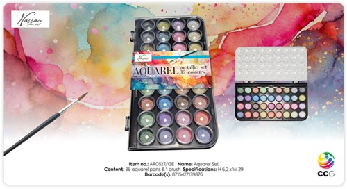 Deze prachtige set bevat 36 metallic kleuren die een schitterende glans geven aan al je aquarelschilderingen. Ideaal voor kunstenaars van alle niveaus, deze verf is perfect voor het creëren van betoverende effecten en unieke accenten in je werk. De rijke pigmenten en soepele consistentie maken het eenvoudig om prachtige kleurverlopen en details aan te brengen. De verpakking is FSC gecertificeerd.
