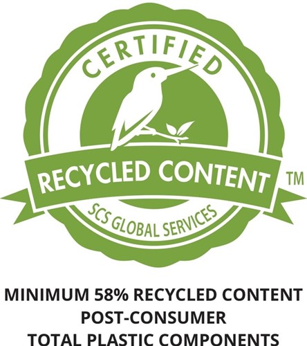 Gecertificeerd gerecycled materiaal dat voldoet aan de SCS Recycled Content Standard V8-0 voor minimaal 58% post-consumer recycled materiaal van de totale kunststofcomponenten. Met uitzondering van de printplaat en kabels.