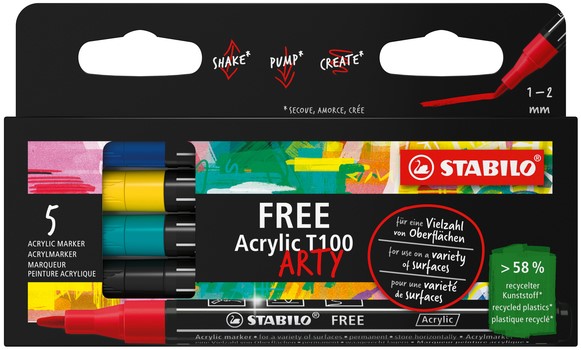 De STABILO FREE Acrylic Marker laat je creatieve ideeën op vele manieren de vrije loop. Personaliseer oppervlakken, probeer het zelf en verlaat je comfortzone.