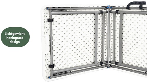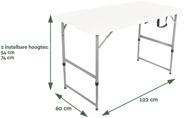 Betrouwbaar, compact en lichtgewicht: De vouwtafel heeft een afmeting van 120x60x74 (lxbxh) en heeft 2 instelbare hoogtes, zo stel je hem eenvoudig in op 54 en 74 cm hoogte. Perfect voor zowel kleine appartementen als grotere evenementenruimtes. Hij heeft een sterk stalen frame met buizen met een doorsnede van 25mm. Door het lichtgewicht honingraat design weegt de vouwtafel slechts 8,5 kg. Deze inklapbare tafel is gemaakt uit robuuste materialen wat zorgt voor een kwalitatief product, en is daarom zowel binnen als buiten te gebruiken. Dit komt de maximale draaglast ten goede (max 80kg). De opvouwbare tafel is gemaakt van HDPE kunststof en bevat gerecyclede materialen. Mede hierdoor heeft het blad van de tafel een gemêleerde witte kleur (deze is dus niet effen wit).