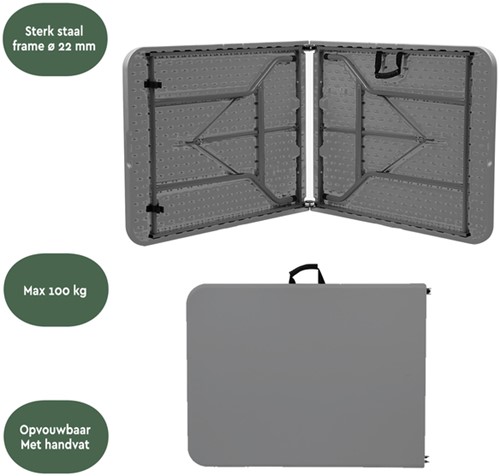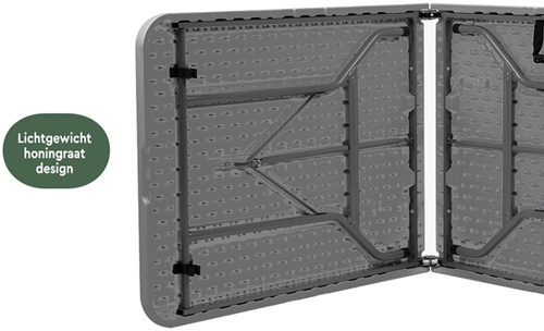 Betrouwbaar, compact en lichtgewicht: De vouwtafel heeft een afmeting van 180x70x74 (lxbxh) en heeft 2 instelbare hoogtes, zo stel je hem eenvoudig in op 54 en 74 cm hoogte. Perfect voor zowel kleine appartementen als grotere evenementenruimtes. Hij heeft een sterk stalen frame met buizen met een doorsnede van 25mm. Door het lichtgewicht honingraat design weegt de vouwtafel slechts 8,5 kg. Deze inklapbare tafel is gemaakt uit robuuste materialen wat zorgt voor een kwalitatief product, en is daarom zowel binnen als buiten te gebruiken. Dit komt de maximale draaglast ten goede (max 100 kg).