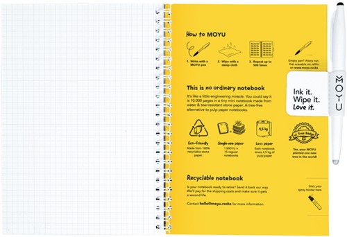 Ooit op steenpapier geschreven? Dit is je kans! Met onze lokaal geproduceerde MOYUs kun je elke pagina maar liefst 500 keer uitwissen. Je schrijft met de bijgeleverde MOYU Frixion pen en wist de inkt met een simpele "wipe" uit door het bijgeleverde doekje vochtig te maken.