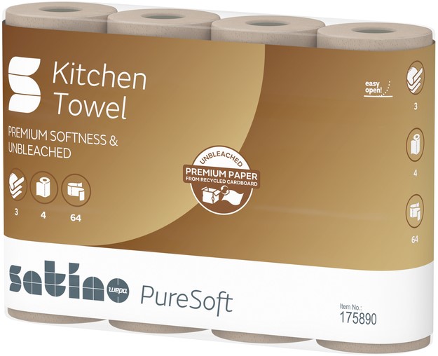 Satino PureSoft is het eerste premium-keukenpapier van Satino by WEPA in 100% recycling-kwaliteit gemaakt van karton. Het ongebleekte Satino PureSoft keukenpapier biedt een onovertroffen zachte en absorberende kwaliteit, is voedselveilig en bijzonder duurzaam.