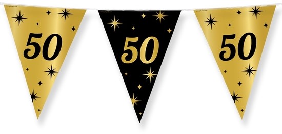 Deze Classy party flags 50 zijn de perfecte versiering om een 50e verjaardag op te leuken. De vlaggenlijn is 10 meter lang en de opdruk is aan beide kanten.